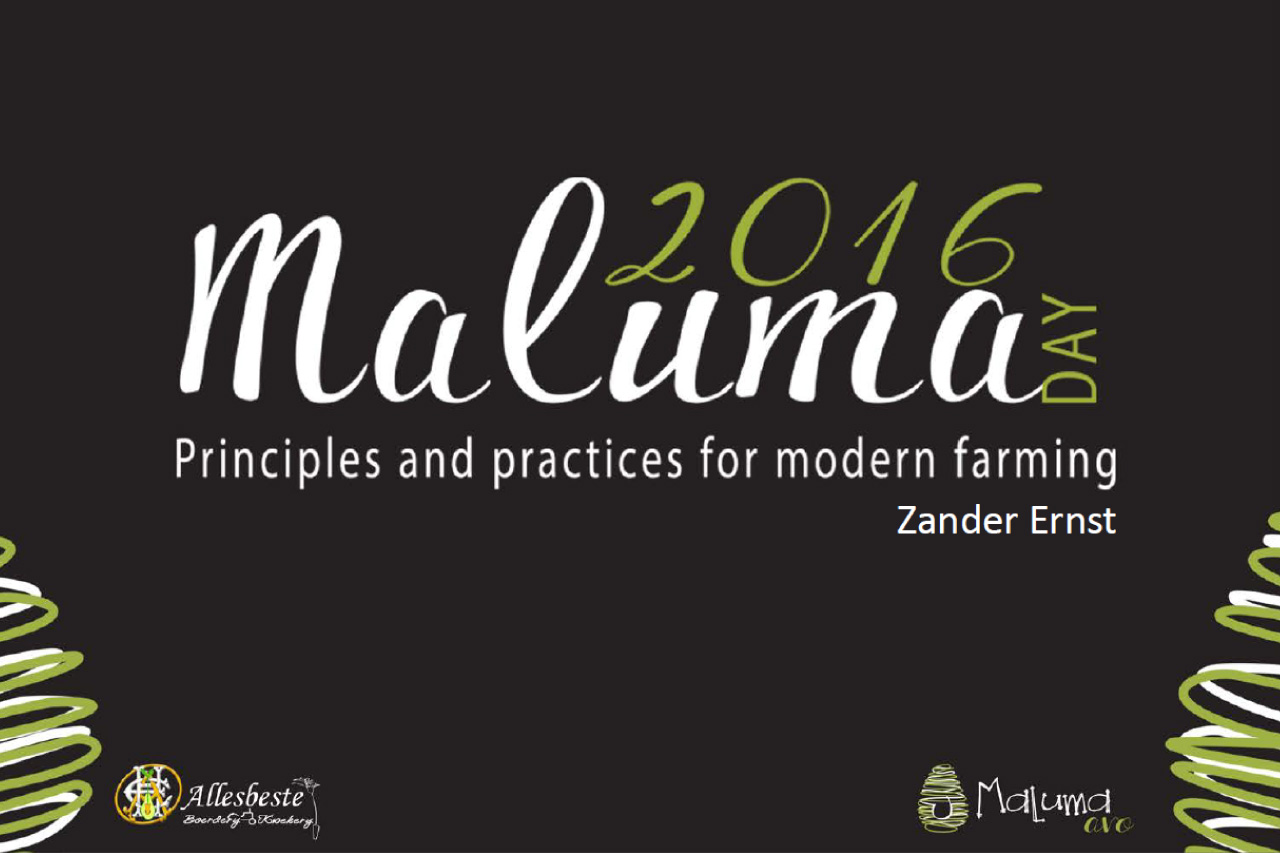 Presentation topic: TOPIC FOR THE DAY: PRINCIPLES AND PRACTICES FOR MODERN FARMING. Date: 9 March 2016. Location: Maluma day 2016 – Merensky High School. Presenter(s): Zander Ernst – Allesbeste Boerdery. File Size: 1.1 MB See presentation