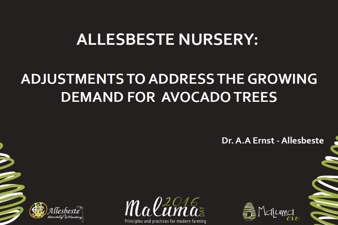 Presentation topic: ALLESBESTE NURSERY: ADJUSTMENTS TO ADDRESS THE GROWING DEMAND FOR AVOCADO TREES. Date: 9 March 2016. Location: Maluma day 2016 – Merensky High School. Presenter(s): Dr AA Ernst – Allesbeste. File Size: 6.9 MB See presentation