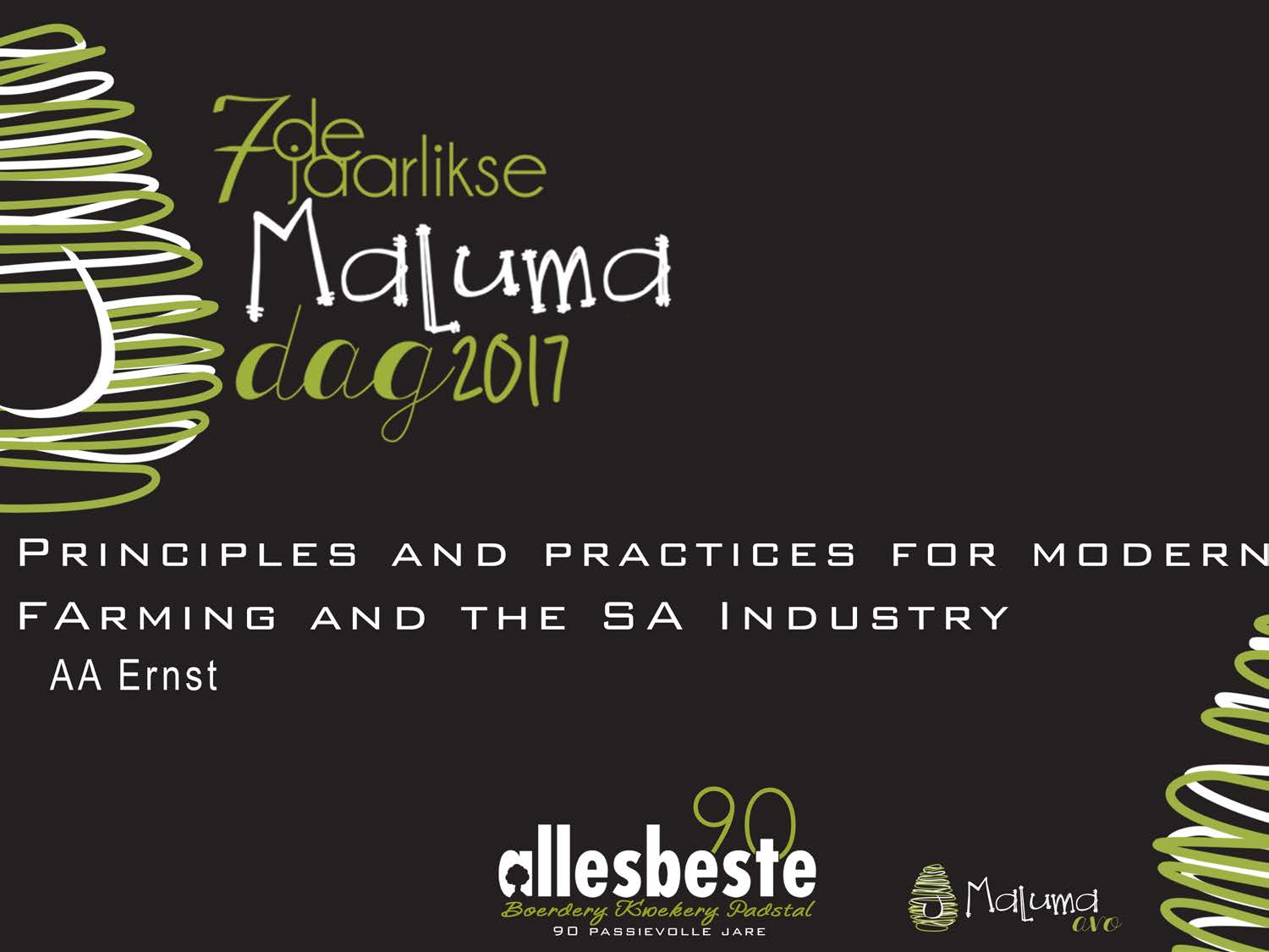 Presentation topic: Theme of the day: Priciples and practices for modern farming and the SA industry. Date: 8 March 2016. Location: Maluma day 2017 – Merensky High School. Presenter(s): Dr AA Ernst – Allesbeste. File Size: 0.5 MB See presentation